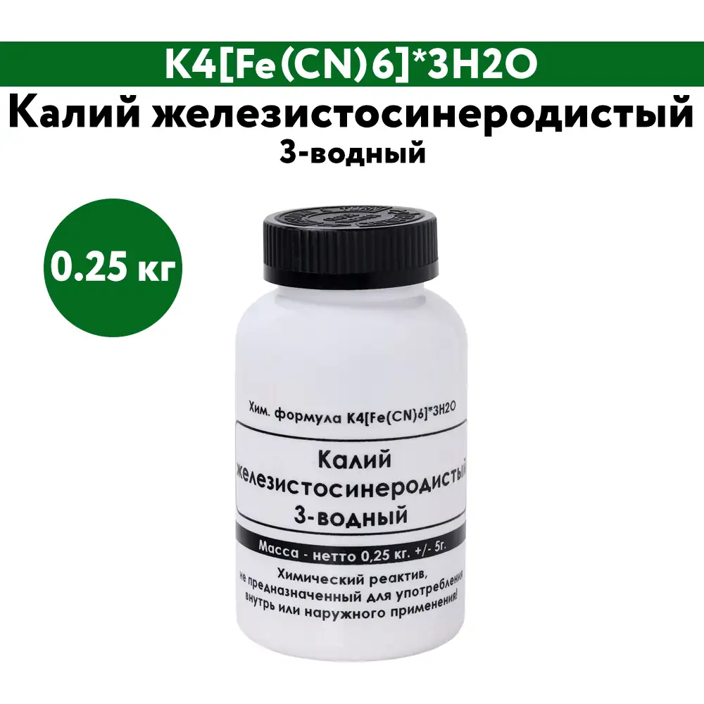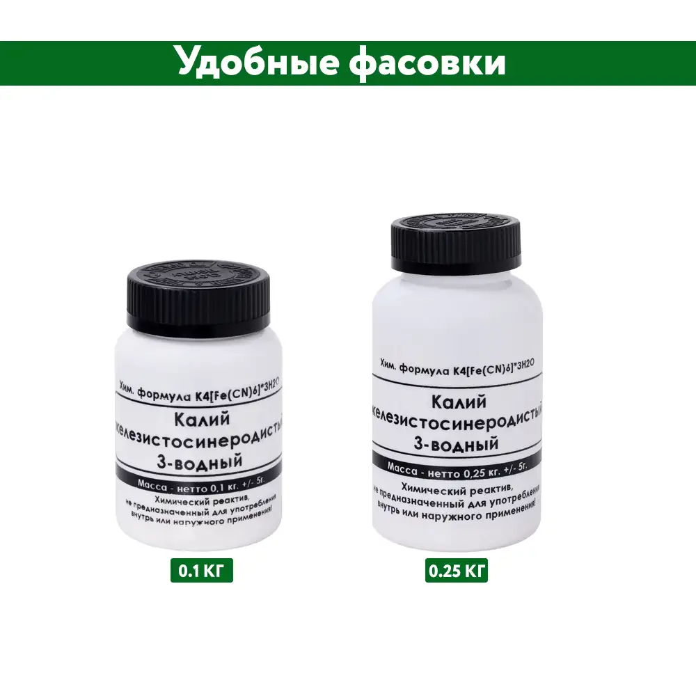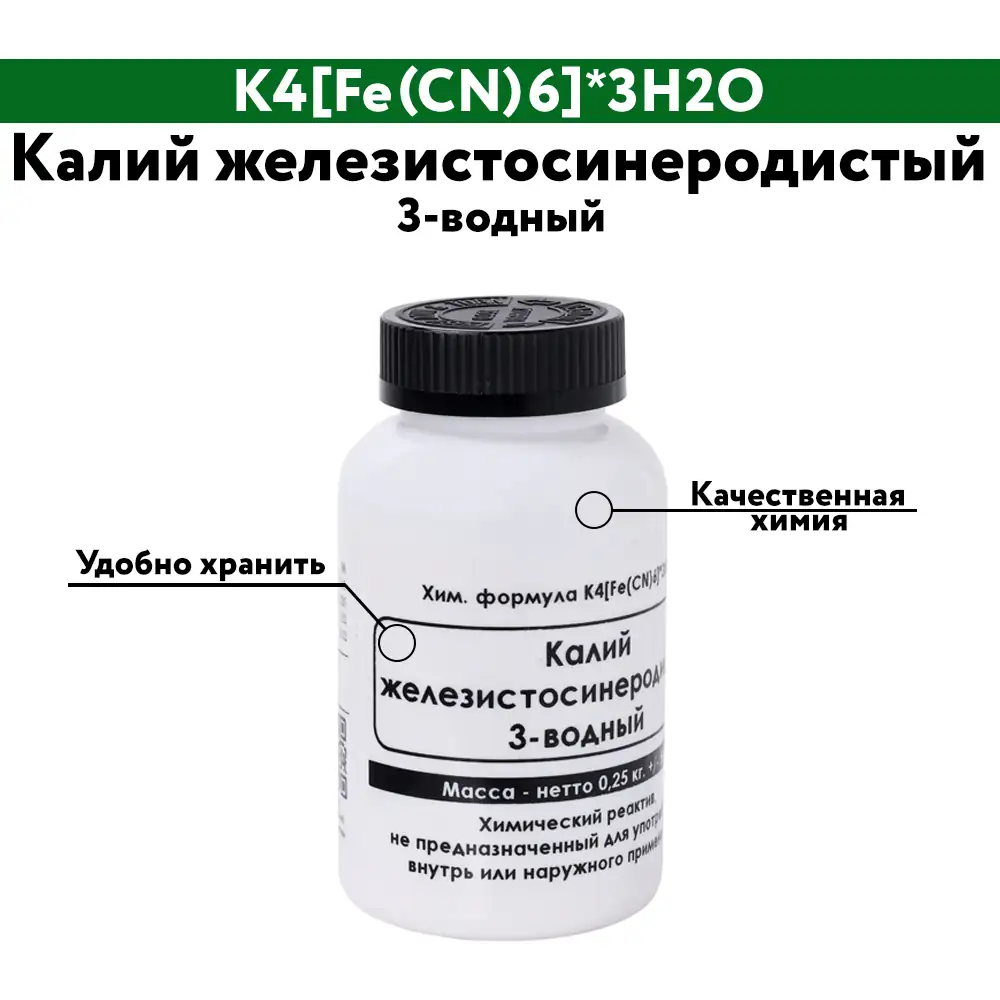 | 3-водный железистосинеродистый калий K4[Fe(CN)6]*3H2O, %, не менее | 98 |